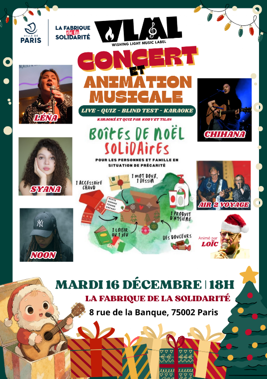 La Fabrique de la Solidarité vous invite le mardi 16 décembre pour une soirée conviviale et musicale. Un moment ouvert à toutes et tous, pour un temps de partage pour créer du lien social et favoriser la rencontre. En partenariat avec l'association Wishing Light